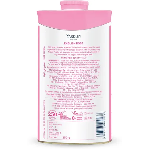 Elevate your daily bathing experience with Yardley London's English Rose Perfumed Talc for Women. This talcum powder is the embodiment of floral elegance, designed to envelop you in a soft, delicate scent that lingers throughout the day.What sets this talcum powder apart is its commitment to skin care. Crafted from natural ingredients, it leaves your skin feeling silky smooth, as if caressed by rose petals. You not only enjoy a fragrant touch of luxury but also genuine skin care.Yardley London, a brand synonymous with Englishness, luxury, quality, and natural fragrances, brings you this talcum powder as a testament to its legacy spanning over 250 years. Trust in a brand that has become the quintessential choice for those who appreciate authentic, premium quality floral fragrances and personal care products. Complete your daily beauty regimen with English Rose Perfumed Talc and embrace the softness, freshness, and elegance it offers.